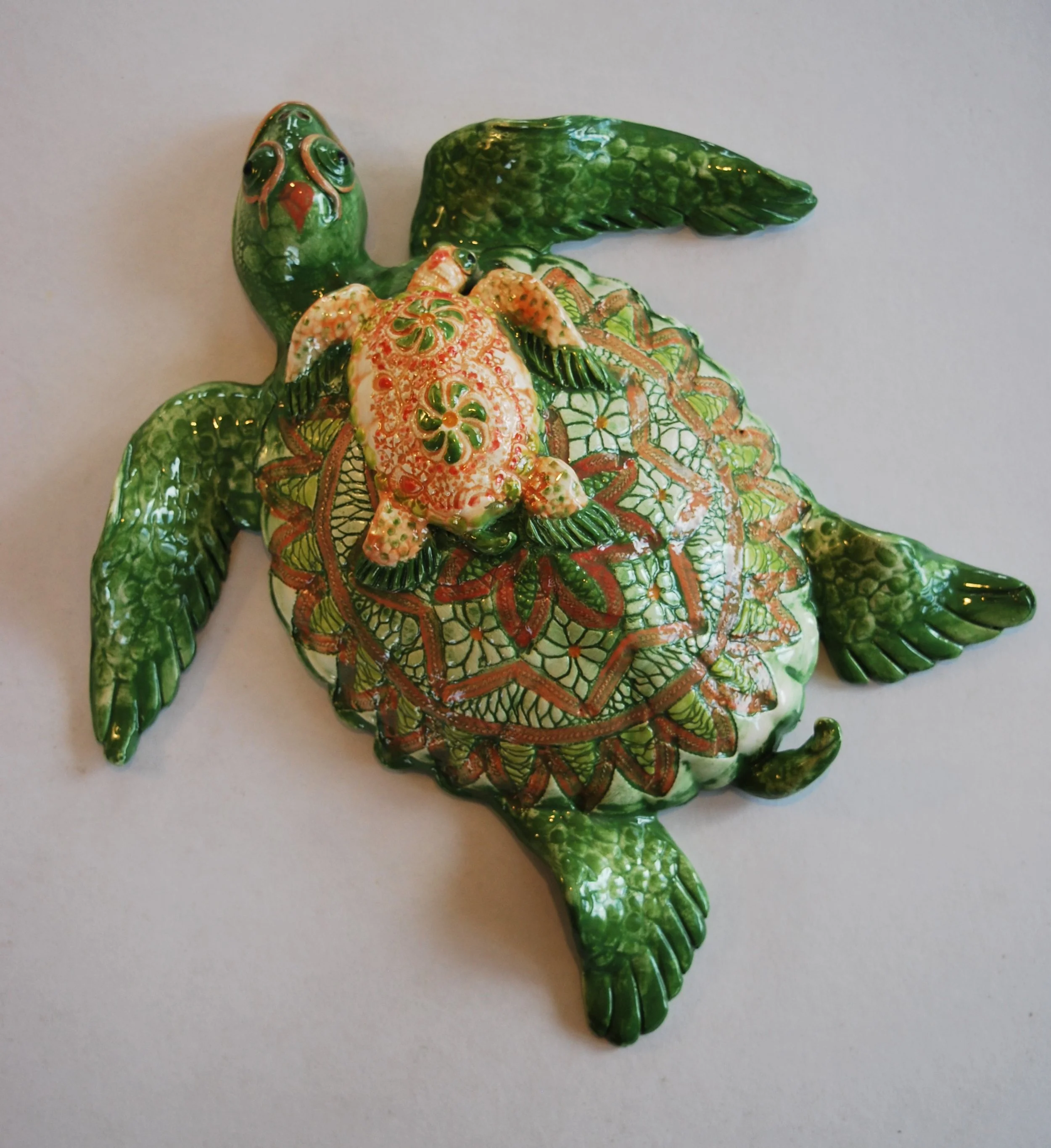 Sea Creatures are schools of fishes, sea horses, turtles, horseshoe crabs, and merfolk. They are adorned with delicate patterns of vintage lace, then colorfully glazed and lustered.